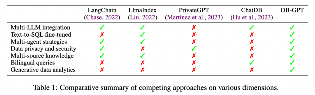 在此研究中,作者提出了 DB-GPT 框架,这是一个旨在借助 LLM 技术而打造的智能化、生产级的项目,它使用私有化技术提取、构建和访问数据库的数据。DB-GPT 不仅充分发挥了 LLM 的自然语言理解和生成的潜能,而且还通过 agent 代理和插件机制不断优化其数据驱动的引擎。表 1 展示了 DB-GPT 和 LangChain、LlamaIndex、PrivateGPT、ChatDB 等工具在多个维度的综合比较。综上所述,DB-GPT 具有以下明显优点: