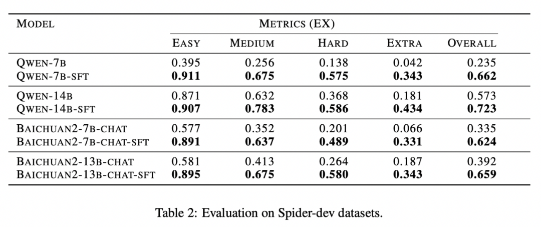 表 2 显示了 DB-GPT 系统在 Text-to-SQL 微调 pipeline 的有效性,无论是通义千问模型还是百川模型,微调后模型 EX 指标都有显著提升。