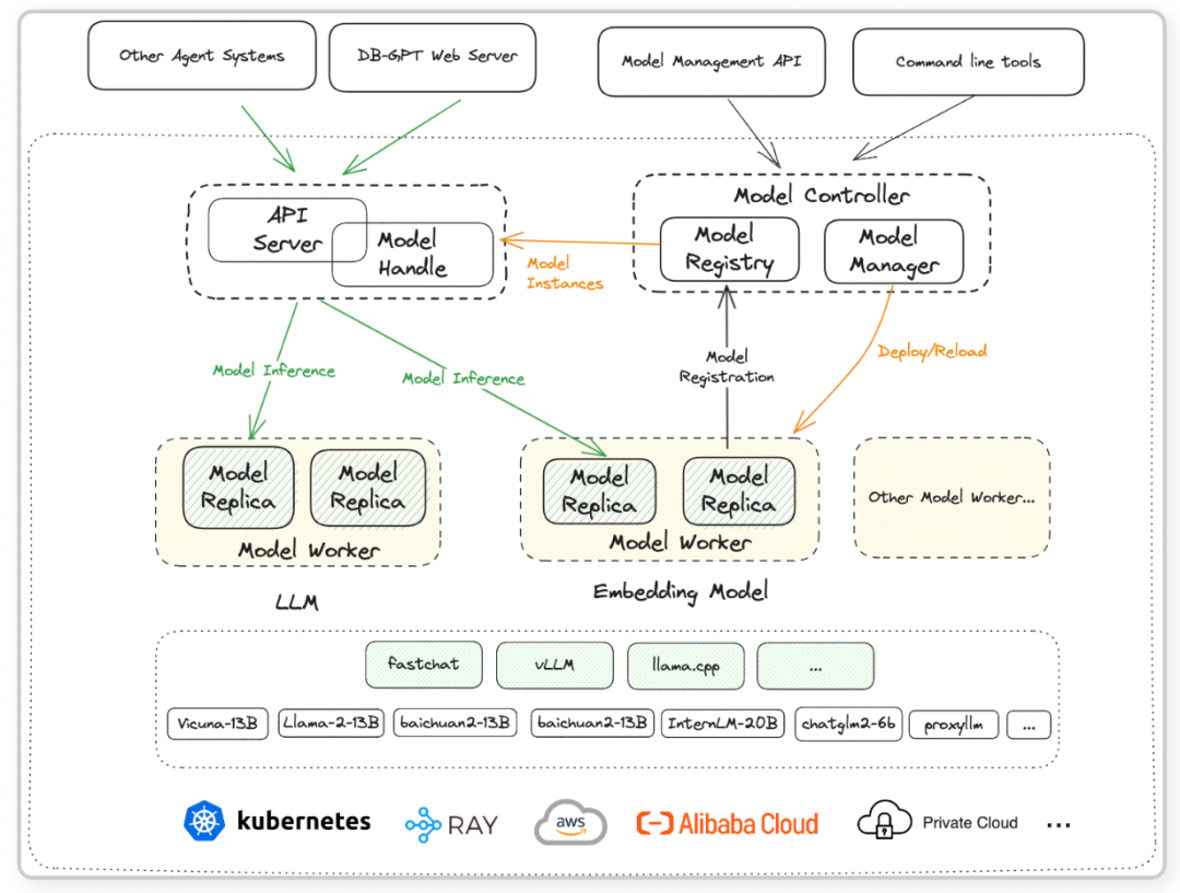 模型部署层:在 DB-GPT 的模型部署框架层内,一系列组件协同工作。由 API server 和 model handler 组成的任务负责向应用程序层提供强大的模型服务功能。model controller 占据中心位置,不仅负责元数据的治理,同时也充当大规模部署架构的纽带。此外,model worker 的作用至关重要,它直接与推理设备和底层基础环境直接连接,确保模型能够发挥最佳的性能。