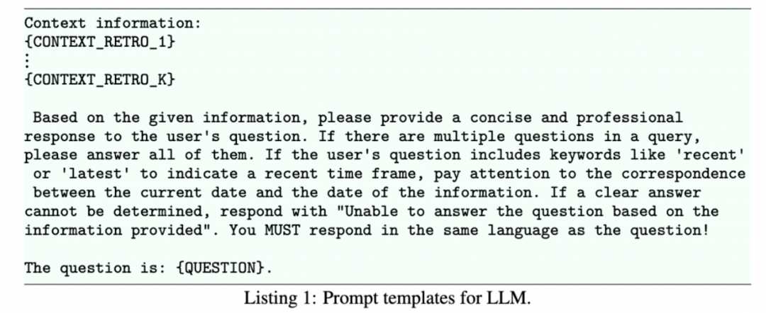 LLM 的自适应 ICL 和生成。在这一阶段,DB-GPT 系统通过执行 ICL 来响应生成。系统首先根据和查询 query 的余弦相似度对 K 个搜索结果进行排序,然后选取排名最前的 J 个(其中 J ≤ K)结果,将这些结果插入到预定义的上下文提示模板中,最后 LLM 生成响应。ICL 是一种在训练或推理阶段通过在处理过程中纳入额外的上下文来提高 LLM 性能的技术。ICL 的引入不仅增强了语言模型对上下文的理解,还提高了模型的可解释和推理技能。值得注意的是,ICL 的性能很大程度上取决于特定的设置,包括提示模板、选择的示例、上下文示例的数量以及示例的顺序。在 DB-GPT 系统中,提供了多种制定提示模板的策略(示例见清单 1)以适应不同的需求。此外,论文采用了相应的隐私保护措施,确保个人信息得到妥善保存。