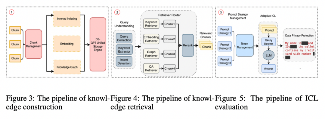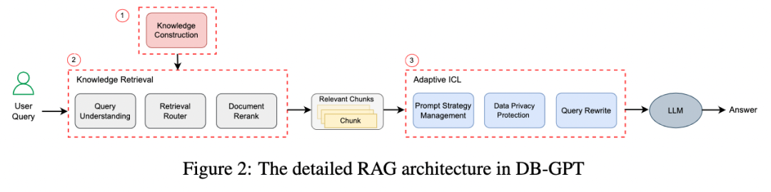 尽管 LLM 通常在大量的开源数据或其他地方的独有数据上训练,但是仍然可以使用 RAG 技术通过额外的私人数据增强 LLM 知识问答能力。如图 2 所示,DB-GPT 的 RAG 系统架构由三个阶段组成:知识构建、知识检索和自适应上下文学习 (ICL)。