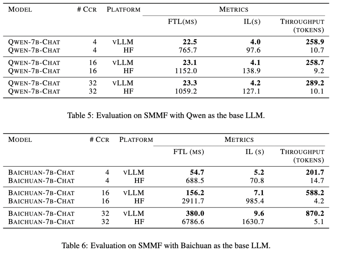 Qwen 和 Baichuan 模型在 SMMF 方法上的实验结果如表 5 和表 6 所示,结果表明使用 vLLM 模型推理框架显著提高了模型的吞吐量,同时大幅度降低了首字延迟和推理延迟。值得注意的是,随着数量并发用户数增加,使用 vLLM 框架推理带来的性能提升变得特别明显。因此,DB-GPT 选择将 vLLM 集成为 SMMF 使用的默认推理框架。