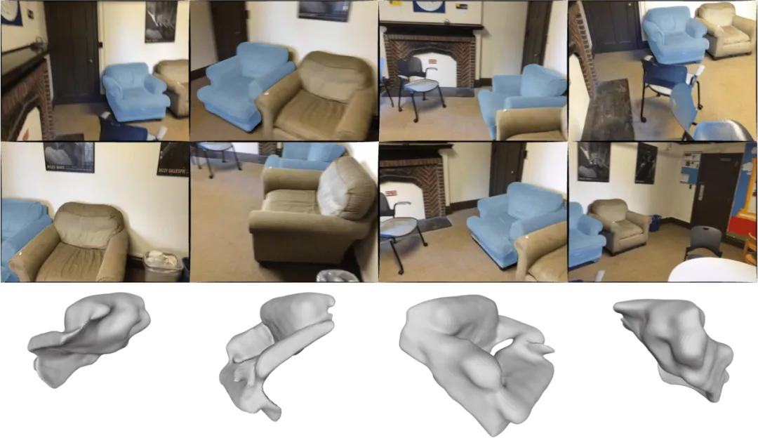 随着 NeRF 和 NeuS 等技术的发展,imap 和 vMap 等技术能够利用可微渲染来优化物体的几何结构,这些方法能够重建出更加贴合真实物体表面的网格模型,也能够重建多个类别的物体,打破单一物体类别的限制。然而,由于场景内部拍摄角度的约束,很多物体都是被遮挡的,比如靠近墙壁的物体,或者彼此遮挡的物体。在物体被遮挡的情况下,这些方法重建出的物体往往是不完整的,如下图所示。这些不完整的三维模型无法支持大角度的旋转和大范围平移,就很难被各种下游任务利用。
