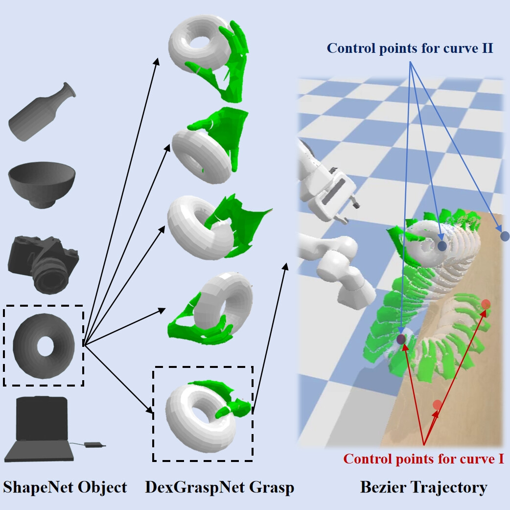 在抓取姿势方面,GenH2R-Sim 从 ShapeNet 中引入了丰富的 3D 物体模型,从中挑选出 3266 个适合交接的日常物体,使用灵巧抓取的生成方法(DexGraspNet),总共生成了 100 万个人手抓住物体的场景。在运动轨迹方面,GenH2R-Sim 使用若干控制点生成多段光滑的 Bézier 曲线,并引入人手和物体的旋转,模拟出手递物体的各种复杂运动轨迹。