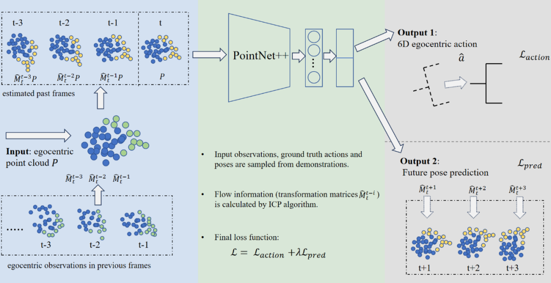 基于大规模专家示例,GenH2R 使用模仿学习的方法,构建 4D 策略网络,对观察到的时序点云信息进行几何和运动的分解。对于每一帧点云,通过迭代最近点算法(Iterative Closest Point)计算和上一帧点云之间的位姿变换,以估计出每个点的流(flow)信息,使得每一帧点云都具有运动特征。接着,使用 PointNet++ 对每一帧点云编码,最后不仅解码出最终需要的 6D egocentric 动作,还会额外输出一个物体未来位姿的预测,增强策略网络对未来手和物体运动的预测能力。