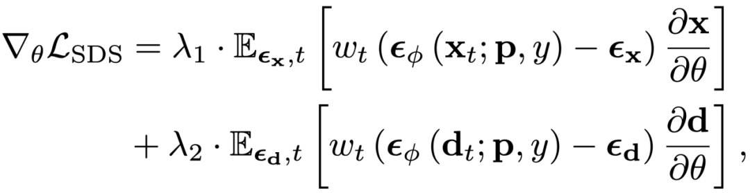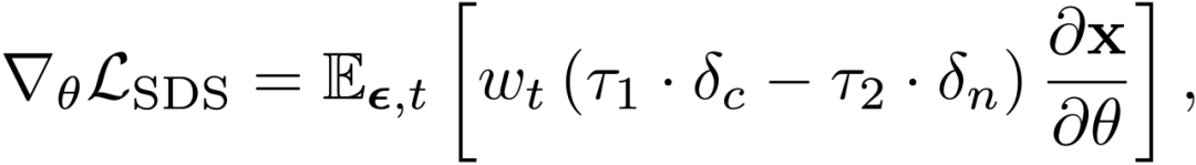 为了促进文本与 3D 生成内容之间的对齐,DreamFusion [1] 使用较大的无分类器引导尺度来更新 3D 场景优化的分数匹配差异项: