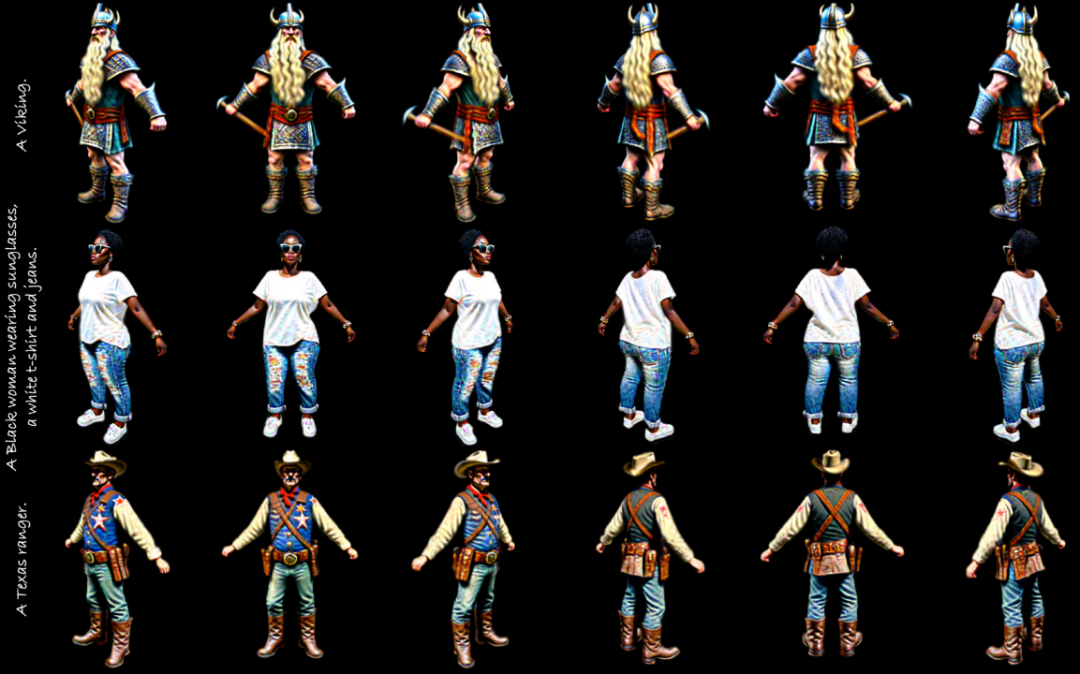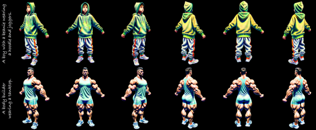 2. 后背视图的渲染纹理可能看起来模糊,这是因为 2D 姿势条件模型大多是在人类正面视图上训练的,而人类后视图的先验知识很少。