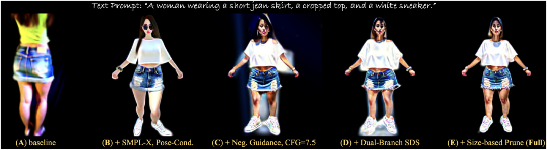 此外,研究者还通过消融实验验证了各个模块的有效性。可以看出,SMPL-X 提供的人体结构先验可以给 3DGS 优化提供初始化信息;负文本引导可以确保逼真的人体纹理外观;图像 RGB 与深度图双分支的 SDS 监督约束可以同时对人体的几何和纹理进行优化;最后根据高斯大小进行剪枝可以去除雾状的伪影: