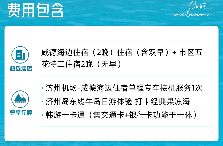 套餐包含济州岛咸德海边住宿2晚+市区2晚住宿+接机+牛岛经典活动等,4晚住宿均含双早。
