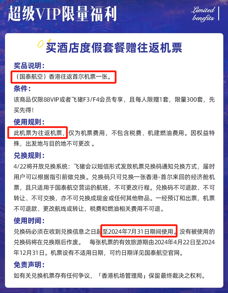 重点来了!这个套餐限量赠送国泰航空香港往返首尔机票1套,仅限88VIP或飞猪F3/F4会员专享。