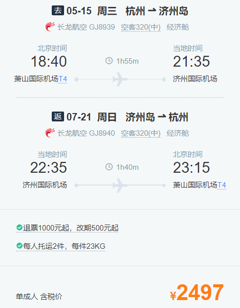 2、上海=济州4天3晚机酒自由行,2999元