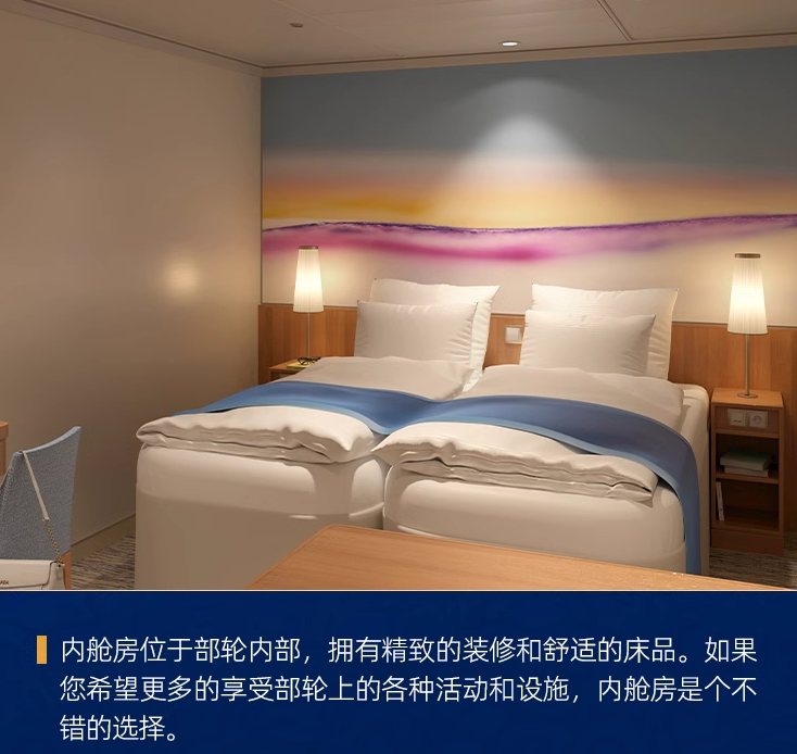 这是我国首艘国产大型游轮,排水量高达13.55万吨。这次是内舱房,且此价格为订金价格,预约出行时间后需补齐尾款。
