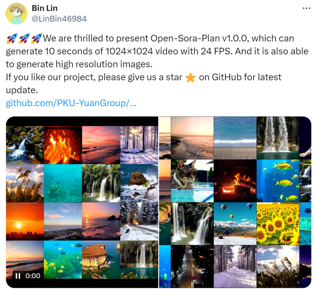 项目作者林彬表示:Open-Sora-Plan v1.0.0 可以生成1024×1024分辨率视频,也能生成10 秒、24 FPS 的高清视频。而且它还能够生成高分辨率图像。