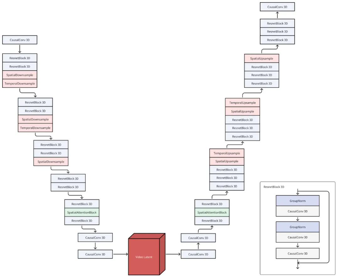 CausalVideoVAE 架构继承自 Stable-Diffusion Image VAE。为了保证 Image VAE 的预训练权重能够无缝应用到 Video VAE 中,模型结构设计如下: