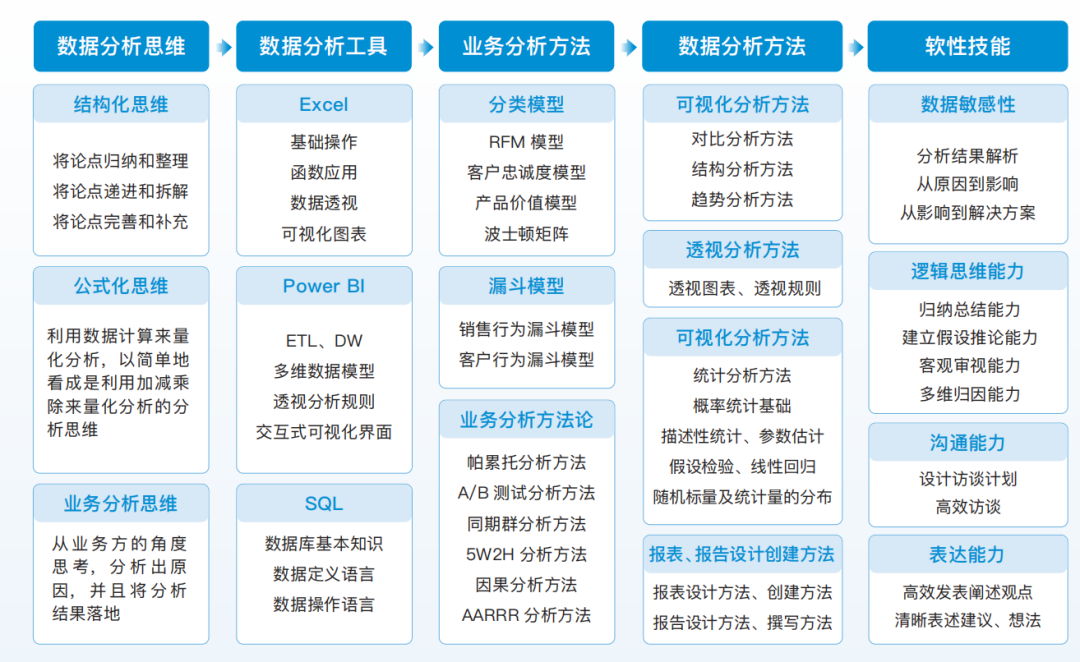 锚定业务人员能够发现业务价值并且推进业务发展的核心能力诉求,从数据分析思维、数据分析工具、数据分析方法、业务价值汇报 4 大维度全面打通业务数据分析整条链路,培养出具备数据分析思维、数据处理工具应用能力、数据可视化表现能力、数据分析分析能力、数据价值汇报能力的绩优业务数据分析人才。