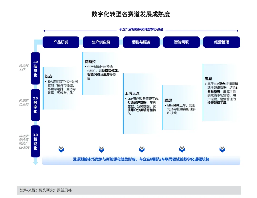 三大数字化发展阶段总体呈现为:1.0 阶段信息化,2.0阶段数字化,3.0阶段智能化。目前车企已然迈进“3.0”智能化阶段,各大汽车企业通过大量引入人工智能技术,从用户体验出发,应用个性化、定制化、自动化的全生命周期业务经营与管理,释放更多不必要的人工投入,提供更具竞争力的产品与服务。