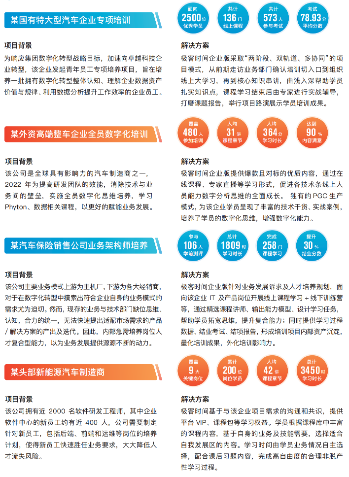基于当前汽车企业高频的数字科技人才培养诉求,极客时间企业版提炼出系列方案,帮助企业高效打造汽车数字人才队伍,获得数字化竞争优势。
