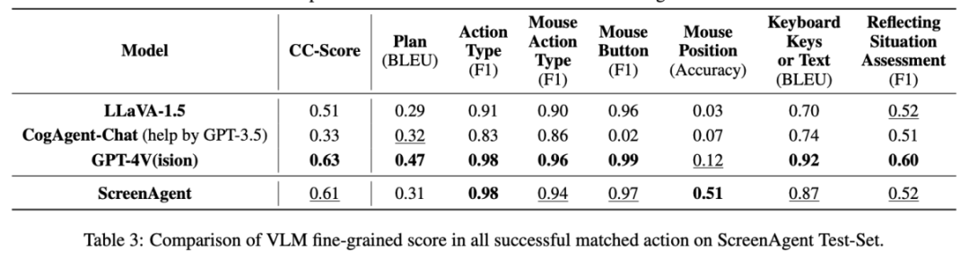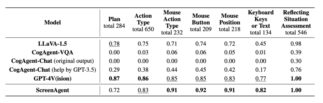 在实验分析部分作者将 ScreenAgent 与多个现有的 VLM 模型从各个角度进行比较,主要包括两个层面,指令跟随能力和细粒度动作预测的正确率。指令跟随能力主要考验模型能否正确输出 JSON 格式的动作序列和动作类型的正确率。而动作属性预测的正确率则比较每一种动作的属性值是否预测正确,例如鼠标点击的位置、键盘按键等。