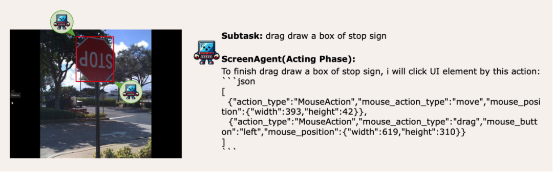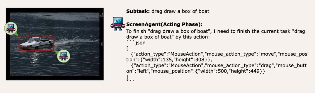 ScreenAgent 还保留了对于自然事物的视觉定位能力,可以通过鼠标拖拽的方式绘制出物体的选框: