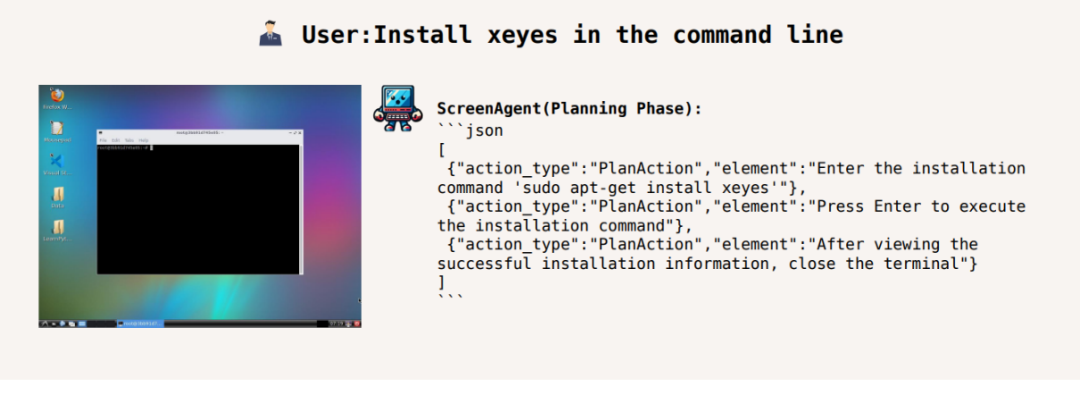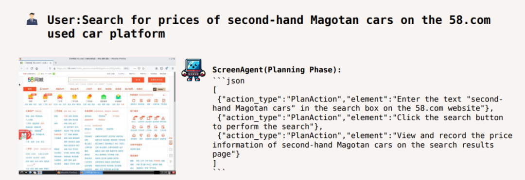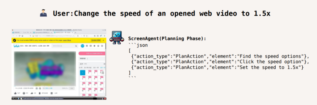 对于要完成某一任务,在任务执行前必须要做好规划活动。ScreenAgent 可以在任务开始前,根据观测到的图像和用户需求,进行规划,例如: