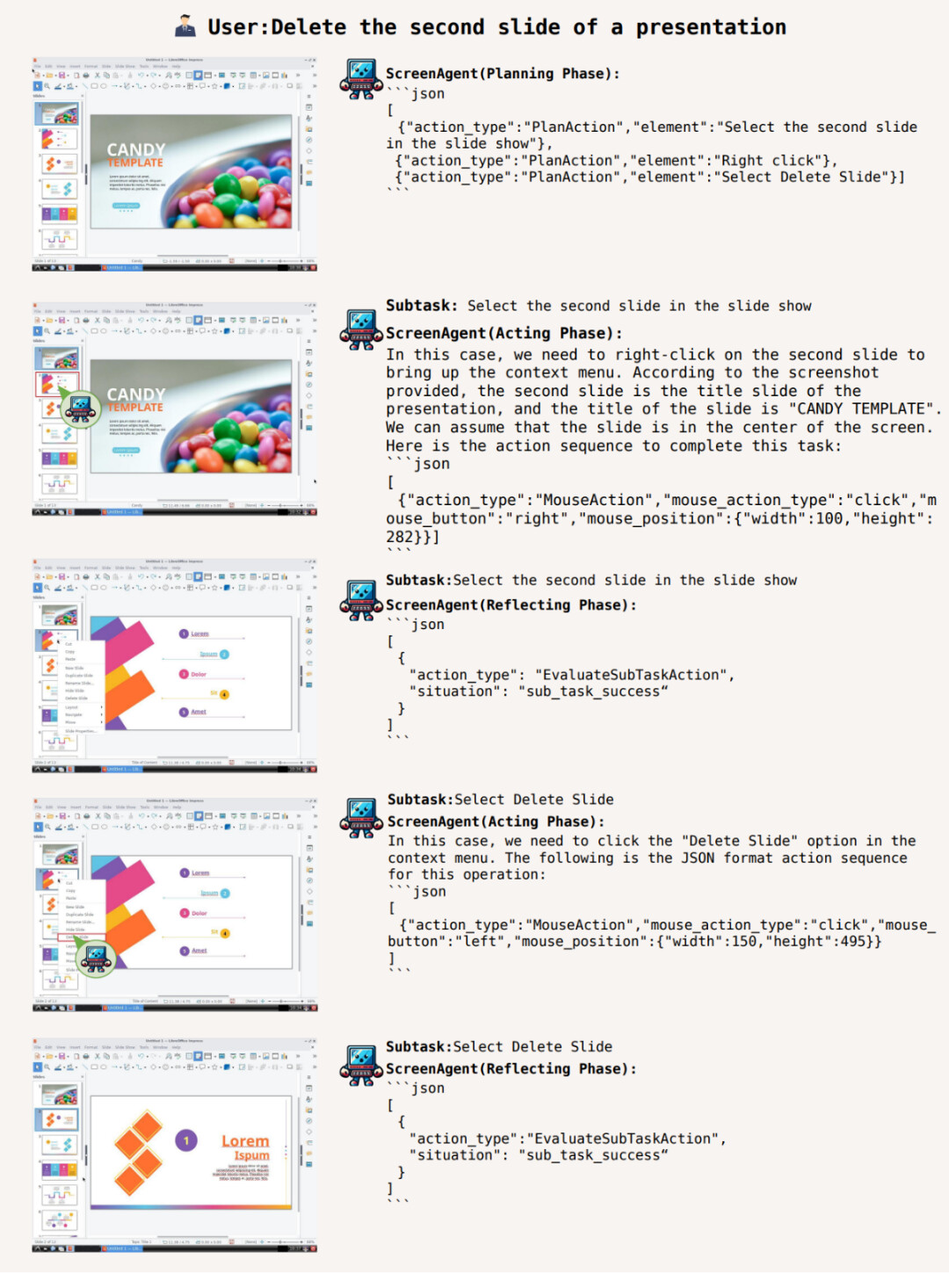 此外,ScreenAgent 可以使用 office 办公软件。例如根据用户文本描述,删除所打开的第二页 PPT: