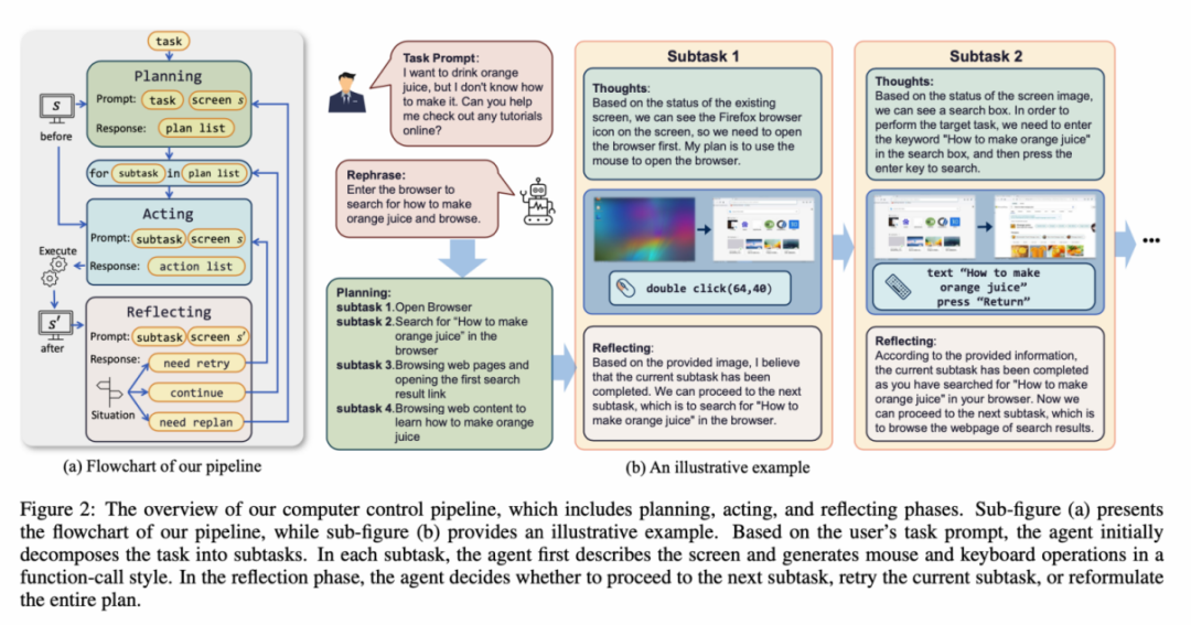 吉林大学人工智能学院团队提出的 ScreenAgent 能够采用与人类一样的控制方式控制电脑,不依赖于其他的 API 或 OCR 模型,可以广泛应用于各种软件和操作系统。ScreenAgent 在「计划-执行-反思」的流程控制下,可以自主地完成用户给定的任务。采用这样的方式,用户可以看到任务完成的每一步,更好地理解 Agent 的行为想法。