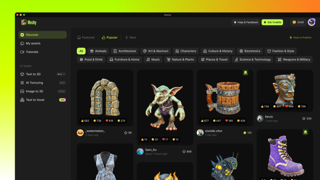 具体来说,Meshy 提供三种很容易上手的使用方式,包括文本转 3D(输入文字 —— 输出 3D 模型)、图像转 3D(提供图片 —— 生成 3D 模型)以及从文本到纹理(透过简单文本描述就能为 3D 内容添加纹理)。在 中,我们已经看到了一些精彩的演示(见以下视频)。