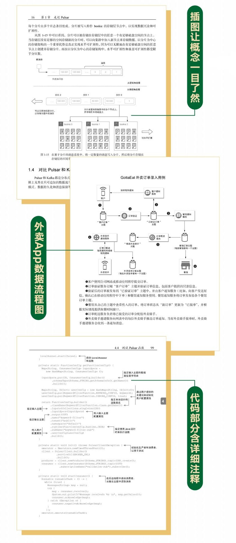本书分为 3 大部分,共有 12 章。第一部分概述 Pulsar 的设计理念和用途。第二部分介绍 Pulsar 的特性。第三部分以一个虚构的外卖应用程序为例,详细地介绍 Pulsar Functions 框架的用法,并展示如何用它实现常见的微服务设计模式。本书示例采用 Java 语言,并同时提供 Python 实现。