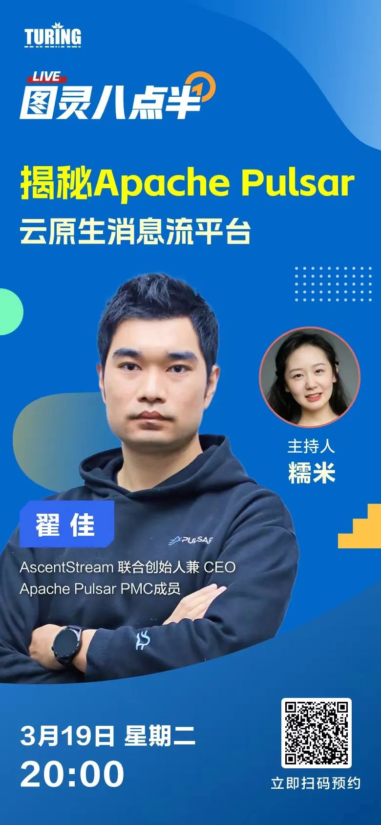 我们同时也邀请 AscentStream 联合创始人兼 CEO 翟佳老师做客图灵八点半,来跟大家聊聊 Apache Pulsar 云原生消息流平台的那些事。欢迎大家预约直播!