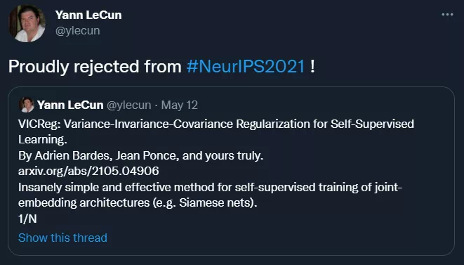 最后,想要投 NeurIPS 的高中生(和指导的家长们)可能需要注意的是,作为全球最受关注的 AI 顶会,该会议的水平很高。毕竟 2018 年图灵奖得主 Yann LeCun 也曾经自爆过论文被拒稿。