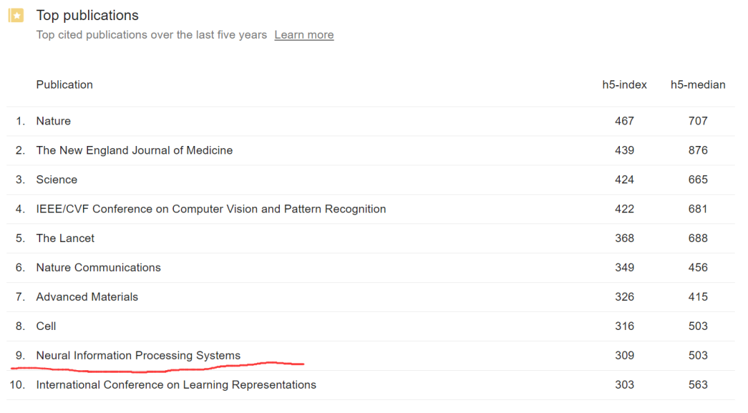 它全称为 Annual Conference on Neural Information Processing Systems,与 ICML、ICLR 并称为机器学习领域难度最大,水平最高的会议。若论学术影响力则与 CVPR、ICLR 一起长期处于 Google Scholar 全球所有学科中期刊、顶会的前十名。