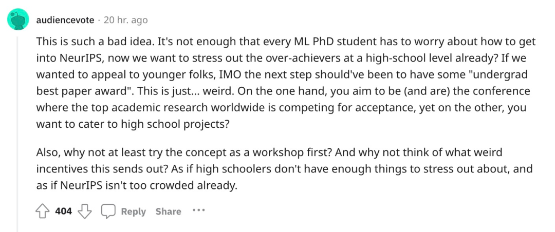 然而,也有很多人认为这是一个很糟糕的主意:「NeurIPS 如果想吸引年轻人,我认为下一步应该是颁发一些『本科生最佳论文奖』。而且,为什么不至少先在 workshop 上尝试一下这个想法呢?」