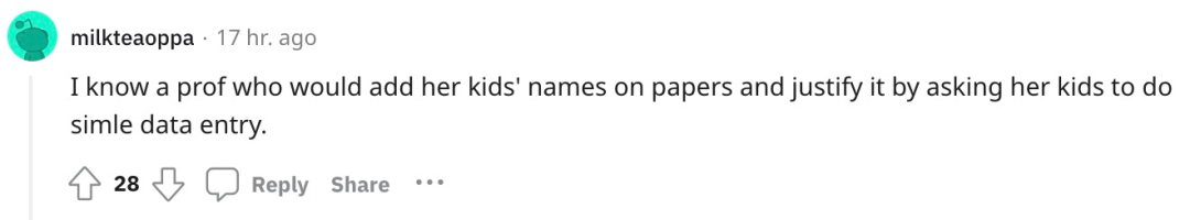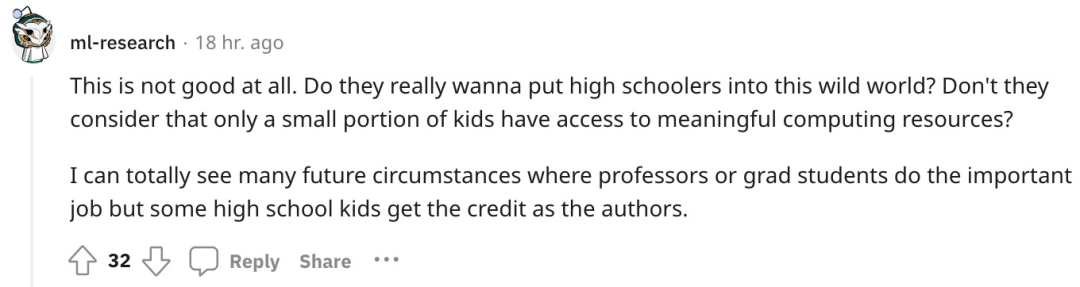 关于完成项目的独立性,很多人也表示担忧,有人举例称「有研究能力的家长可能会给孩子在论文上署名,实际上孩子只是做了简单的数据验证」。「教授或研究生做重要的工作,但一些高中生却获得了作者的荣誉」,这种做法显然不利于学术公平。