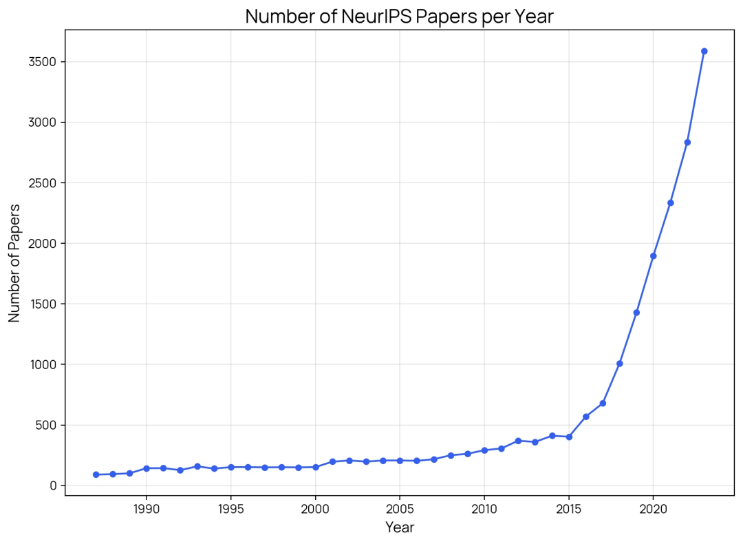 最近 NeuIPS 也和其他 AI 顶会一样变得更加火爆,2023 年的接收论文数量是 2017 年的 5 倍。