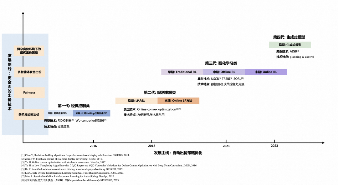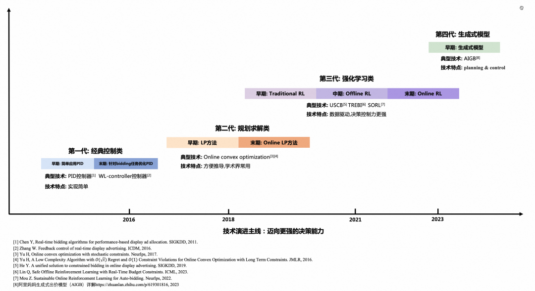 现实环境中在线竞价环境是非常复杂且动态变化的,未来的流量集合也是难以精准预测的,要统筹整个预算周期投放才能最大化效果。作为典型的序列决策问题,第三阶段用强化学习类方法来优化自动出价策略。其迭代过程从早期的经典强化学习方法落地[5][6][8][9],到进一步基于Offline RL方法逼近「在线真实环境的数据分布」[9],再到末期贴近问题本质基于Online RL方法实现和真实竞价环境的交互学习[13]。