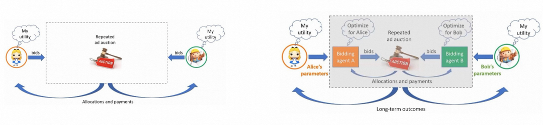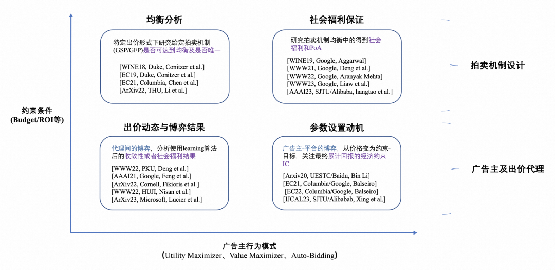 随着自动出价能力的广泛应用,广告主竞价方式相较于之前有了大幅度的改变,广告主向平台提交高层次的优化目标和约束条件,然后由出价代理代表广告主在每次广告拍卖中做出详细的出价决策。对于广告主来说,平台需要把出价和拍卖机制看成一个整体联合设计,典型的工作包括[36]。