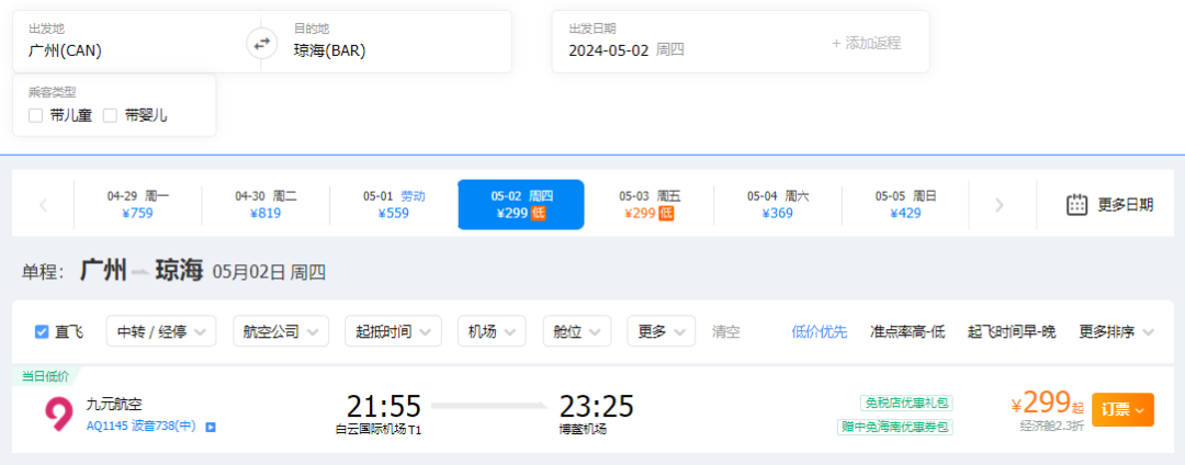 但你要5月1日中午出发、要5月5日下午回来的正点机票、还要超级便宜,那基本不可能。