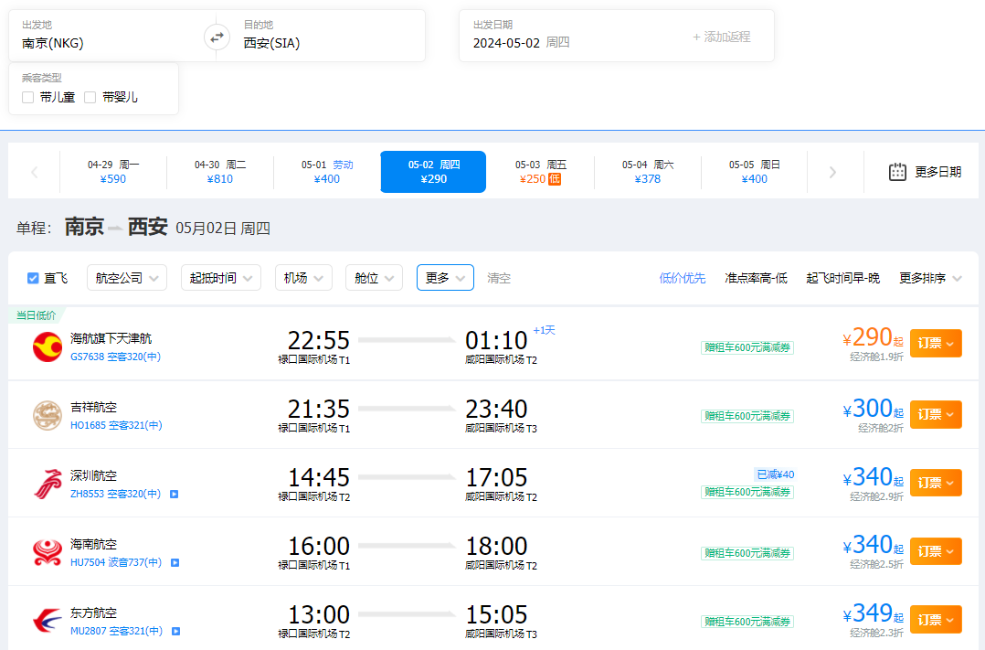 去西安的航线都不贵,回程可以考虑5月6日回来。