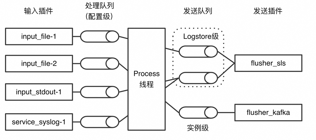 每个采集配置对应一条完整的流水线,各个流水线之间的资源互相独立,互不影响;