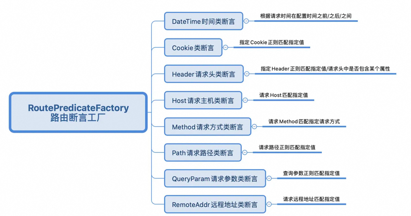 断⾔predicates:参考了Java8中的断⾔Predicate,匹配Http请求中的所有内容(类似于nginx中的location匹配⼀样),如果断⾔与请求相匹配则路由。
