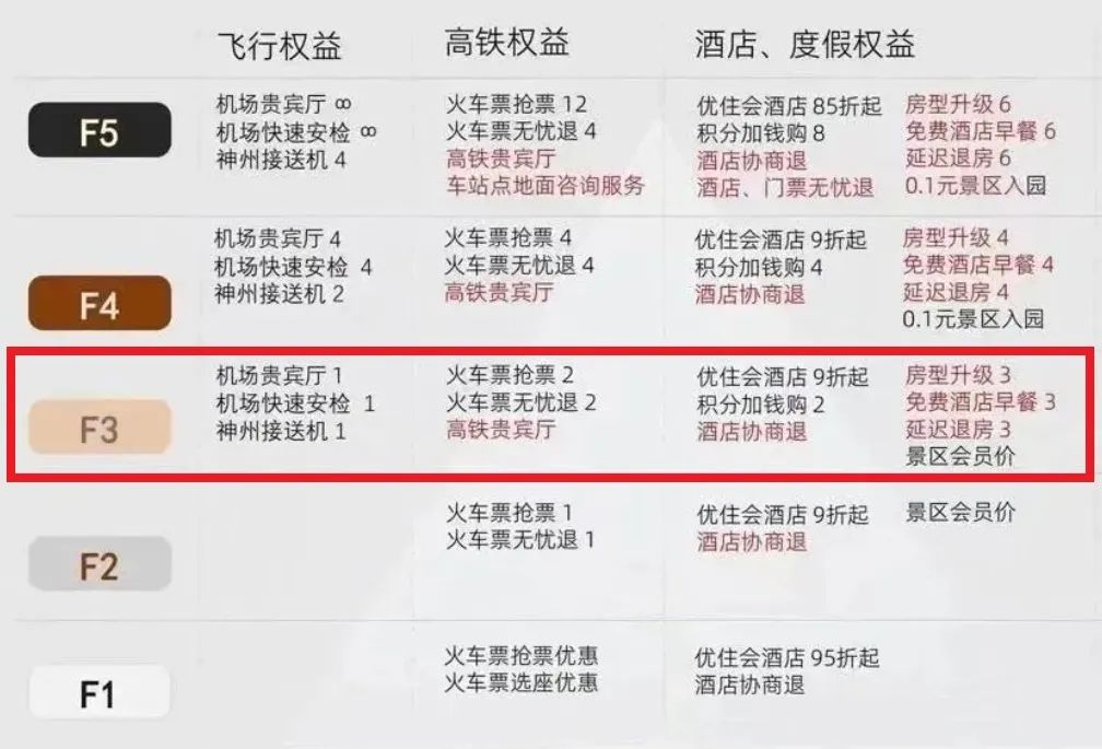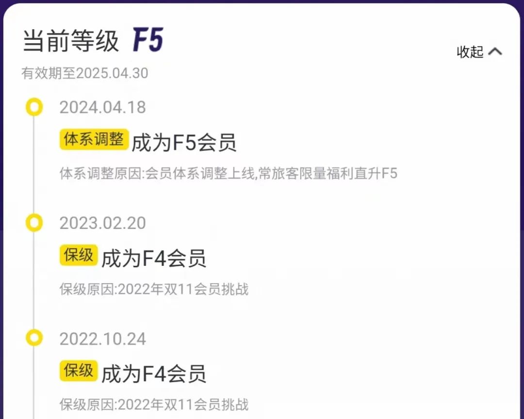 上个月,飞猪调整了旗下F会员的等级体系,原先最高等级是F4,现在最高等级是F6。升级到F6,福利更好,难度也更高。包括并不限于:演唱会包厢、邀请好友成为F5会员、无限次机场高铁全流程服务等权益。据说是对标海豚家的“黑钻会员”。