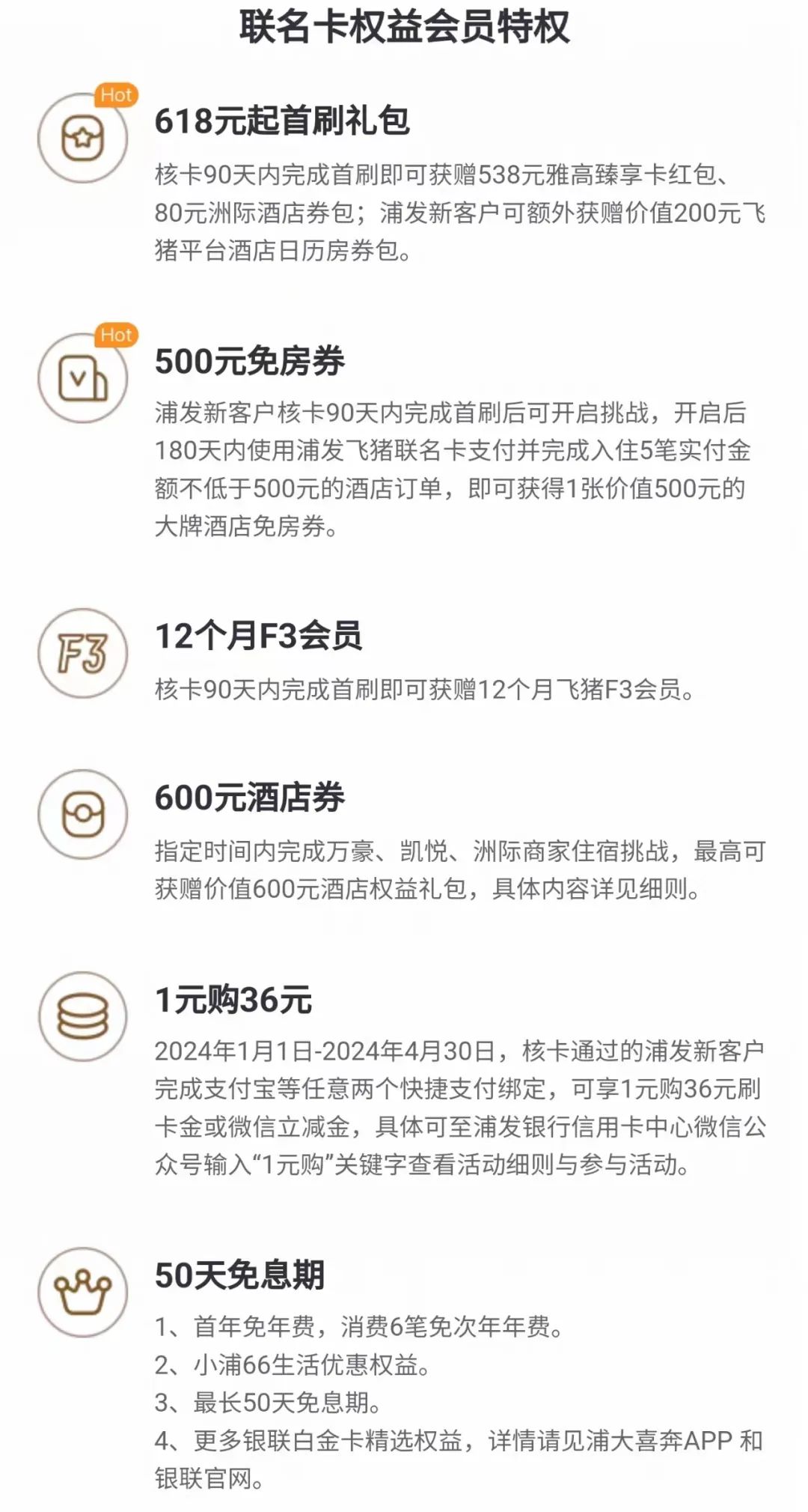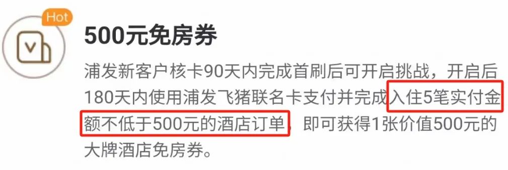 卡片收益最大的,应该就是这个活动了(限新户):6月30日之前开启挑战,180天内在飞猪平台预订满5笔、每笔实付金额*不低于500元且使用浦发银行飞猪联名信用卡进行支付宝绑定支付的在线付酒店日历房*商品订单,完成入住且未发生退款,即可完成挑战。
