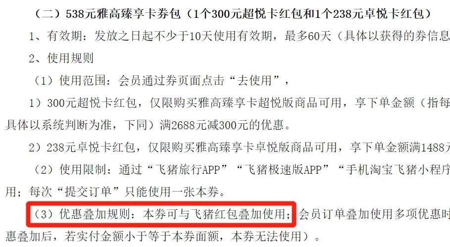 这里有一点不确定,活动的细则中有写明:“优惠叠加规则:本券可与飞猪红包叠加使用”。但帅帅咨询了一下客服,客服称不叠加。反正还是按活动规则来吧,规则在此,就算到时候不行,也能撕。