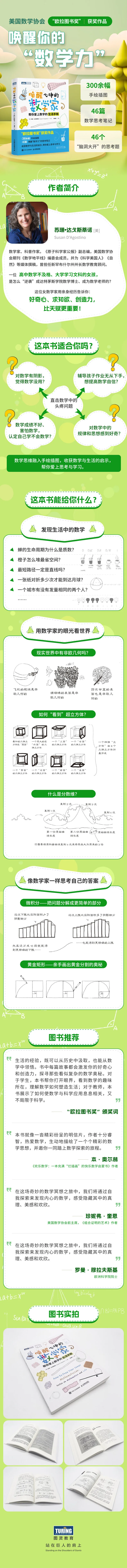 在《唤醒心中的数学家:帮你爱上数学的生活手账》这本书里,作者用300余幅手绘插图,46篇唤醒“数学力”的思考笔记,收获数学与生活的启示,带你爱上思考与学习。