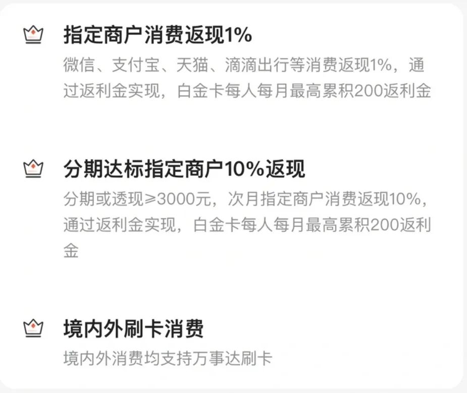 可以看到,其玩法和广发多利卡基本一致,不过没有特殊商户10%返现,只有基础的微信、支付宝、天猫、滴滴出行1%。想要10%返现,必须分期或透支,显然不划算。因此这张卡就是一张指定渠道1%返现的卡片。