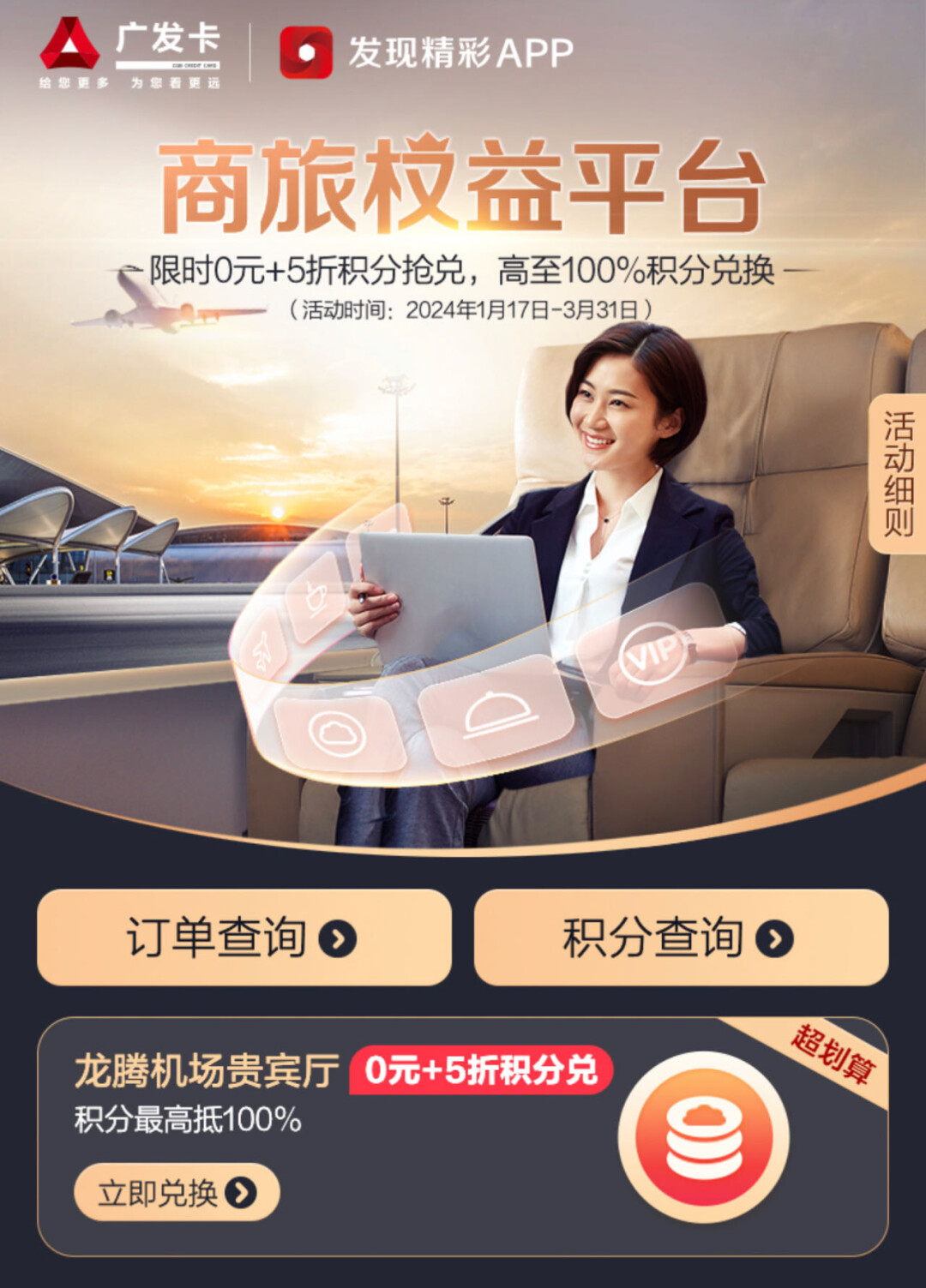 2024年1月17日至3月31日,使用广发信用卡积分可以0元全积分抢兑机场/高铁贵宾厅或餐饮服务,境内境外机场贵宾厅都能换!