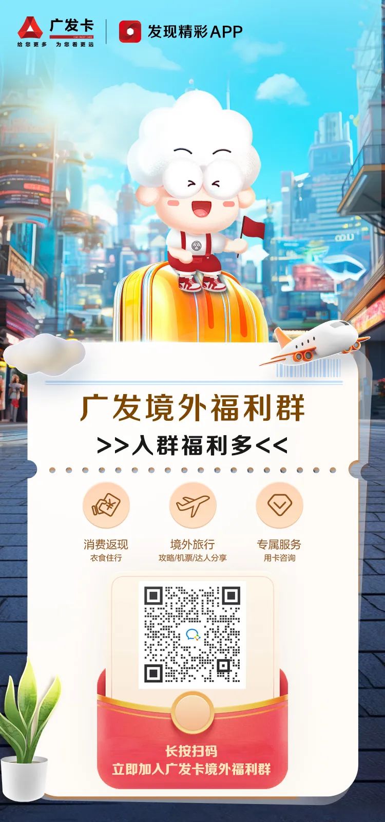 想要了解广发信用卡最新境外返现优惠,或者对返现活动有疑问的同学,可以加入广发出境旅游专属社群。