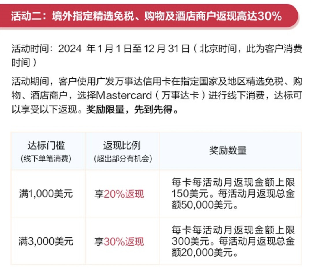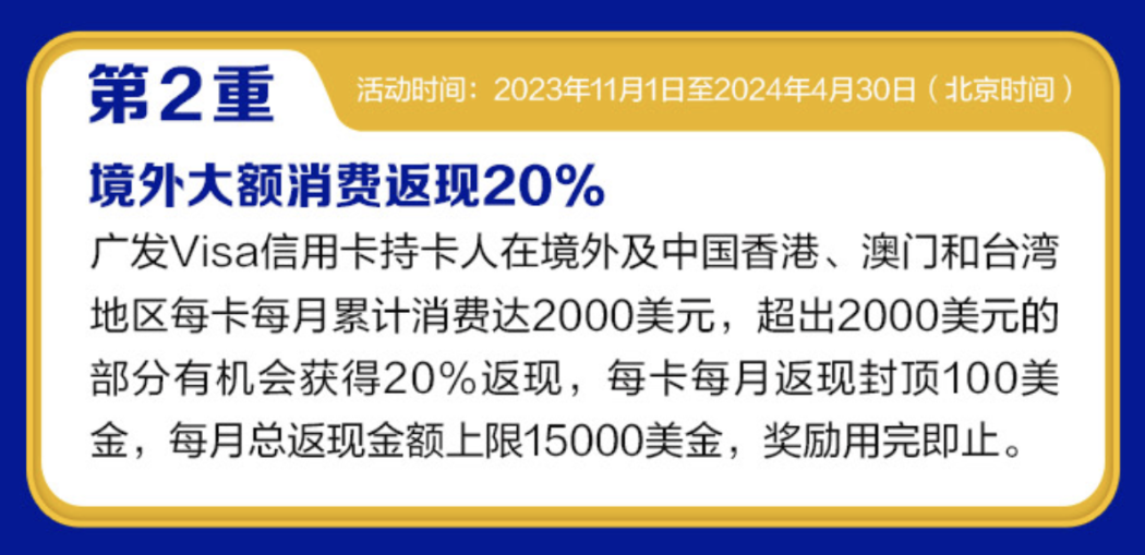 活动一:2023年11月1日至2024年4月30日,境外大额消费返现20%。