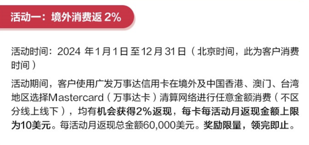 活动一:2024 年1月1日-12月31日期间,境外消费笔笔返现2%,每卡每月返现封顶10美元。