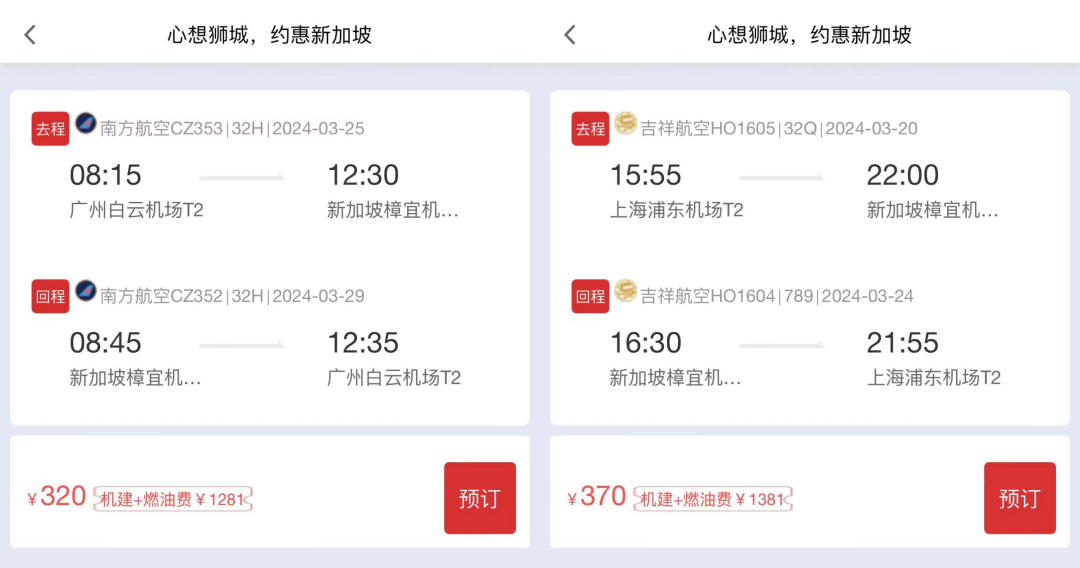 比如3月份,广州往返新加坡 320+1281=1601元/人,两人同行可抢100元券使用,券后含税人均1551元;